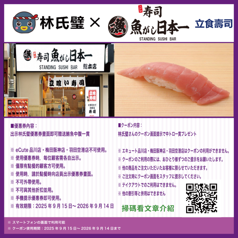 立食壽司魚がし日本一 出示林氏璧優惠券即可贈送贈送鮪魚中腹一貫