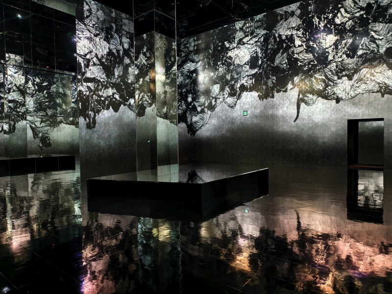 日文名稱是「生と回帰の無常の抽象」,液體會不斷分裂或是聚合,我想應該就是象徵著生命的輪迴吧。可透過玻璃觀看,也可以走上去,作品會有互動的變化。