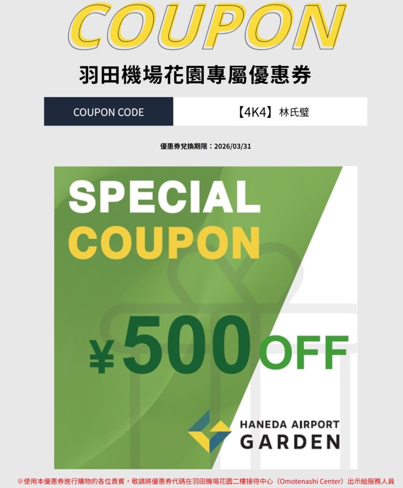 羽田機場花園專屬500yen優惠券:出示房卡或泉天空之湯收據可多領取一張!