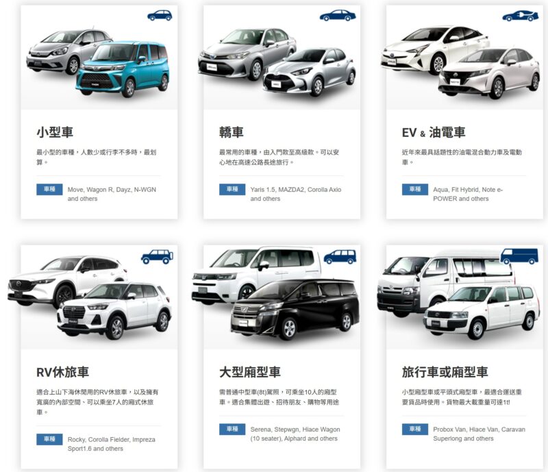 ORIX 歐力士租車可租車型在中文官網可以看到完整介紹,ORIX租車的一大特色,就是TOYOTA,NISSAN、HONDA等各大車廠的車款都有,車種選擇非常豐富!包括了: