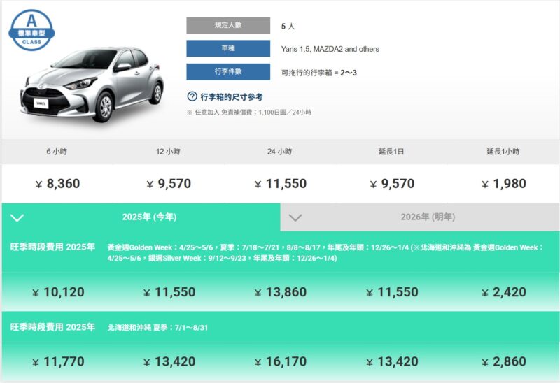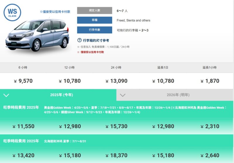 下面是旺季時段費用,比方說2026年黃金週Golden Week:4/24~5/5,夏季:7/17~7/19,8/7~8/15,銀週Silver Week:9/18~9/22,年尾及年頭:12/25~1/2 (北海道和沖縄的夏天7/1~8/31則是最旺季,是最下面這行)